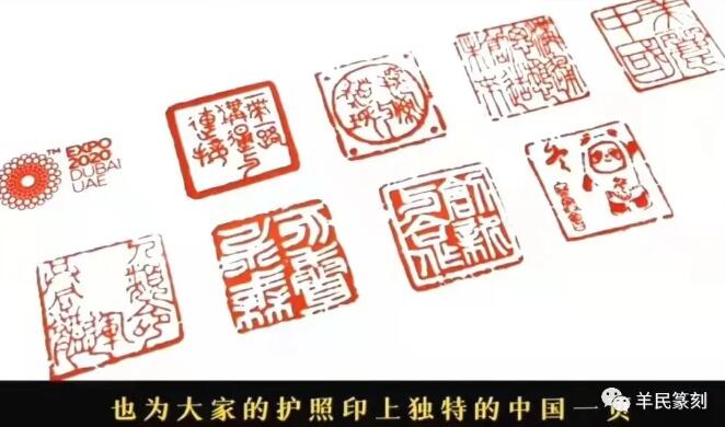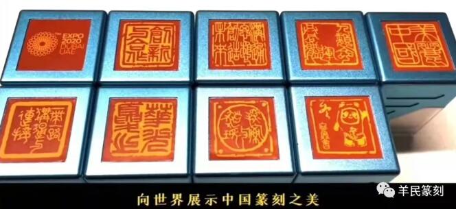 当天,中国馆游客在专业讲解员的引导下参观中国馆,了解篆刻家李羊民团队背后的文化故事,并在馆内的5个打卡点盖上中国馆的9枚特别文化章。中国馆运营团队中青旅博汇工作人员为游客详细介绍了“人类命运共同体”“华夏之光”“美丽中国”“北京冬奥会吉祥物冰墩墩”等印章。这一系列主题文化章为国家一级美术师李羊民设计并篆刻,以秦代小篆为主,通过古朴平整、方中带圆的文字和图案,展现中国馆主题和有关重点展项。